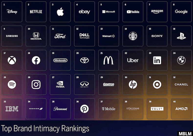 It looks at the top 40 brands people feel most intimately connected to (see the full rankings and methodology here).