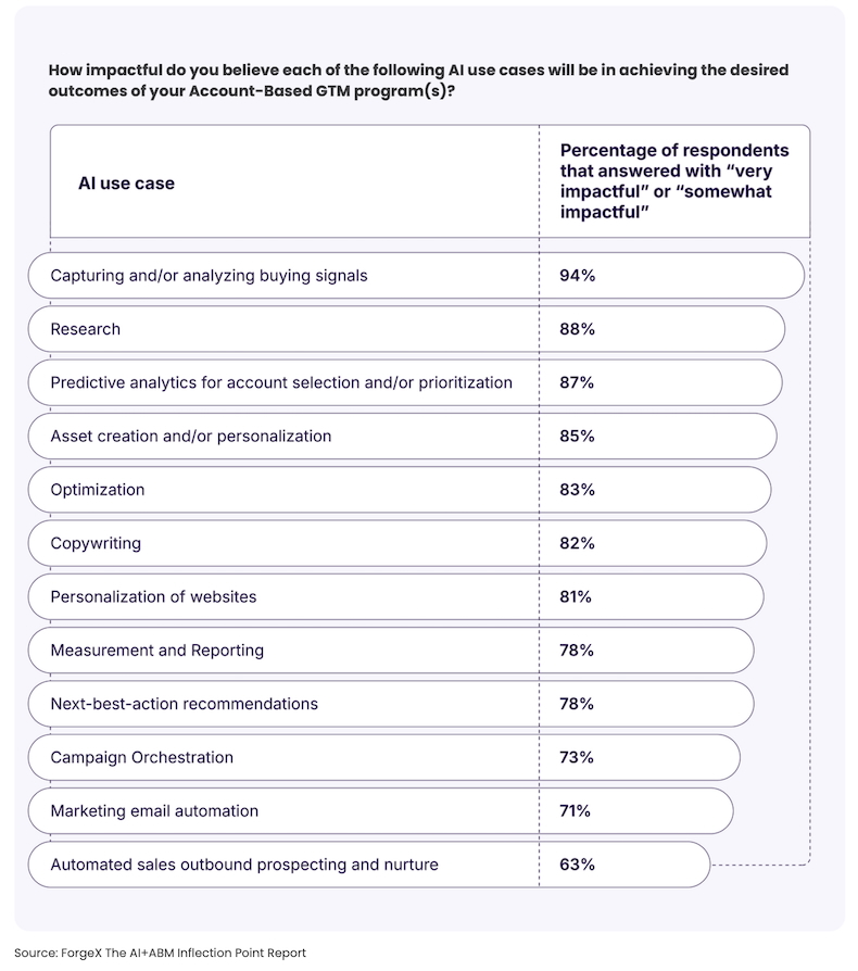 Respondents say the account-based GTM use cases where AI will be most impactful will be capturing/analyzing buying signals, research, and predictive analytics.
