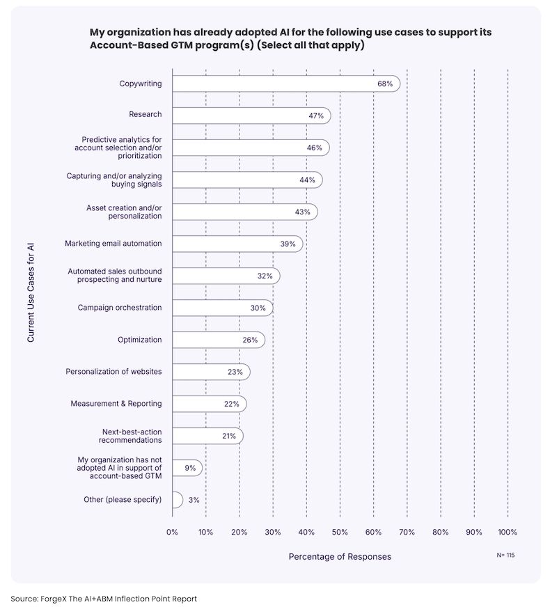 Respondents say they're using AI tools most as part of their account-based GTM programs to help with copywriting, research, and predictive analytics.