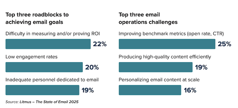 Marketers say the top roadblock to achieving their email goals is difficulty measuring and/or proving ROI. They say the top email operational challenge they face is improving benchmark metrics.