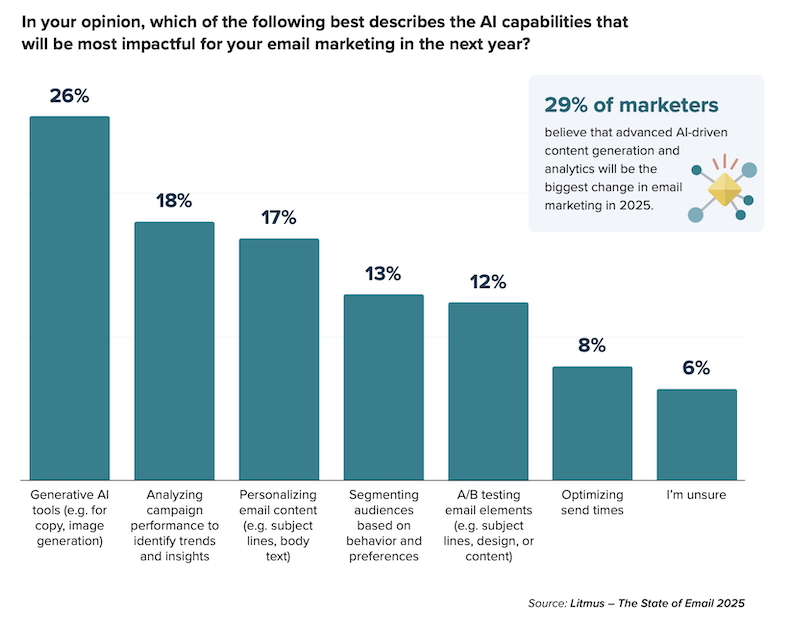 Marketers expect the most impactful AI capabilities on email marketing in the next year to be generative tools (26% say so), analyzing campaign performance (18%), and personalizing email content (17%).