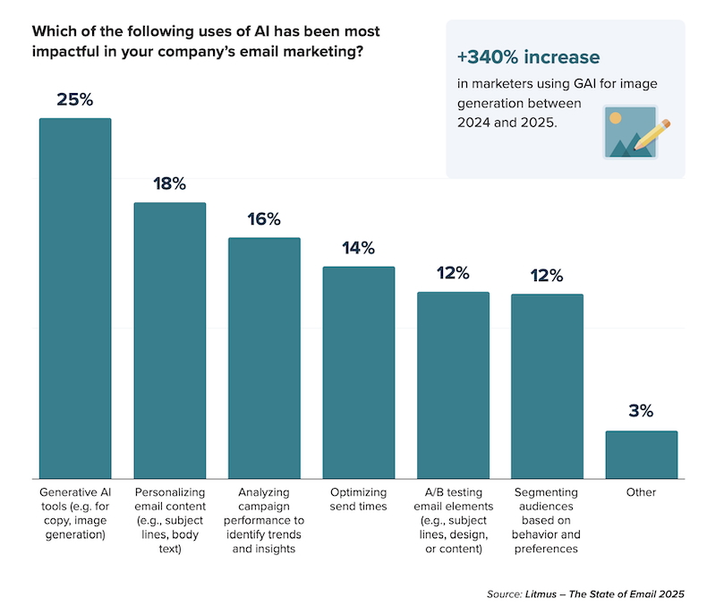 Marketers say AI is having the most impact on their email programs through the use of tools for generating content, according to recent research from Litmus and Datalily.