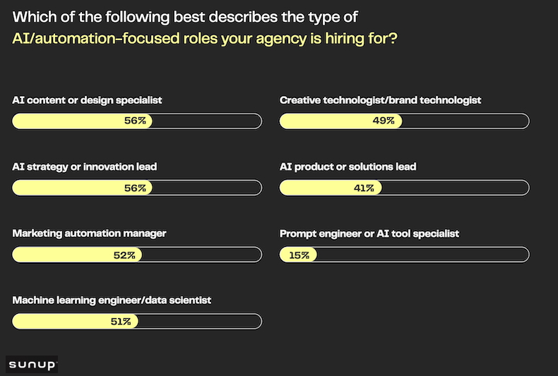 More than half of respondents say their firm is looking to hire for the AI-focused roles of AI content/design specialist, AI strategy/innovation lead, and marketing automation manager.