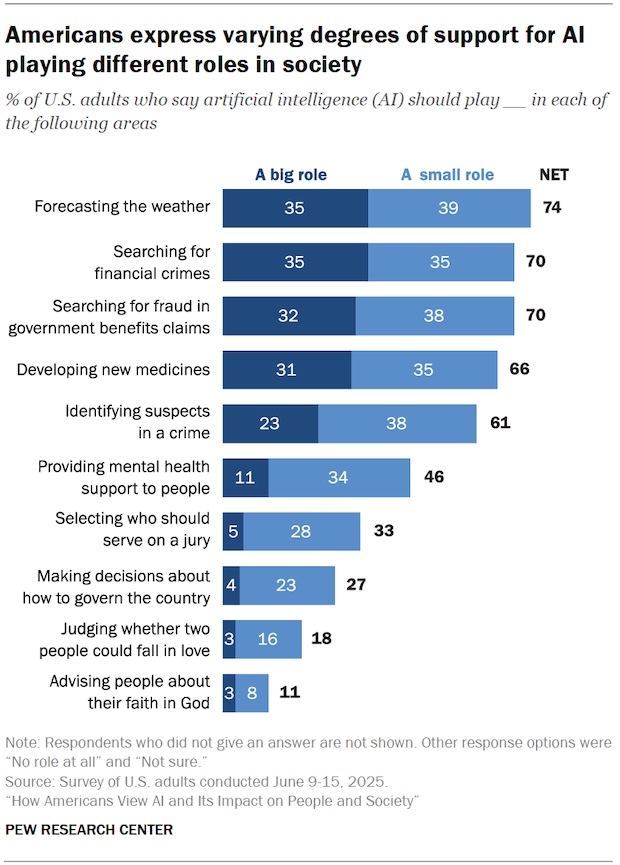 Americans express significantly varying degrees of support for AI's role in various aspects of society. For example, some 74% support the technology's playing a role in forecasting the weather, whereas only 46% support its providing mental health support.
