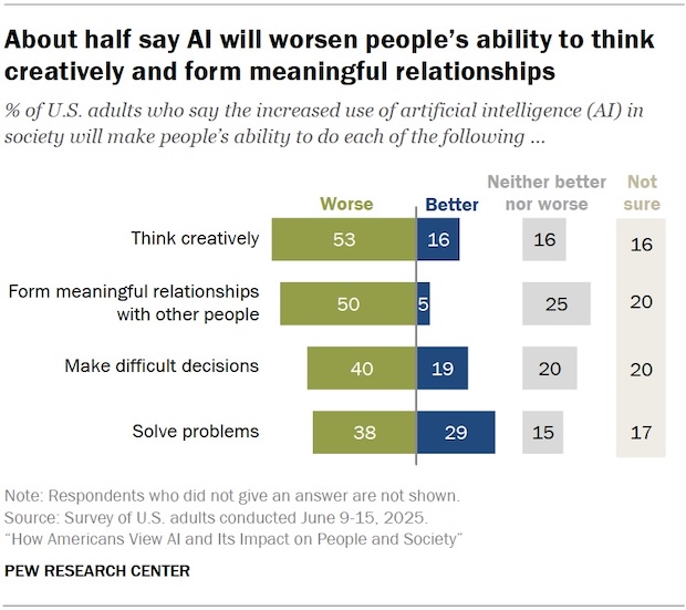 Some 53% of American adults think the increased use of AI will make people's ability to think creatively worse, and 50% think it will make their ability to form meaningful relationships worse.