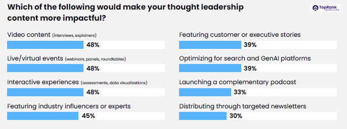 Respondents say their thought leadership content could be made more impactful by having more video content (48% cite), live/virtual events (48%), and interactive experiences (48%).