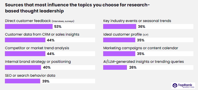 Respondents say the sources that most influence which topics they cover in their research-based thought leadership content are customer feedback (53% cite), CRM data (44%), and marketing trend analysis (44%).