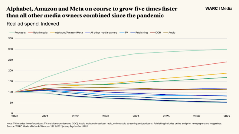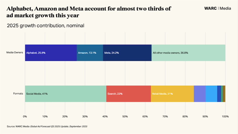 Alphabet, Amazon, and Meta now draw over half of global ad spend outside China, and they are forecast to account for the bulk of ad market growth this year, according to recent research from WARC.