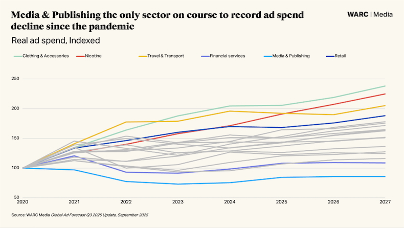 Among the 19 industry sectors monitored by WARC, clothing and accessories brands are set to have increased ad spend the most since the pandemic, whereas media and publishing brands are the only ones on course to have a decline in spend.