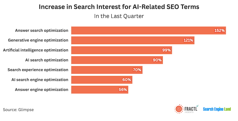 The AI-related SEO terms that have seen the largest recent increases in search interest are "answer search optimization," "generative engine optimization," and "artificial intelligence optimization."