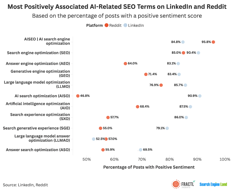 The AI-related SEO term with the most positive sentiment on Reddit is "AISEO / AI search engine optimization" and the term with the most positive sentiment on LinkedIn is "AISO / AI search optimization."