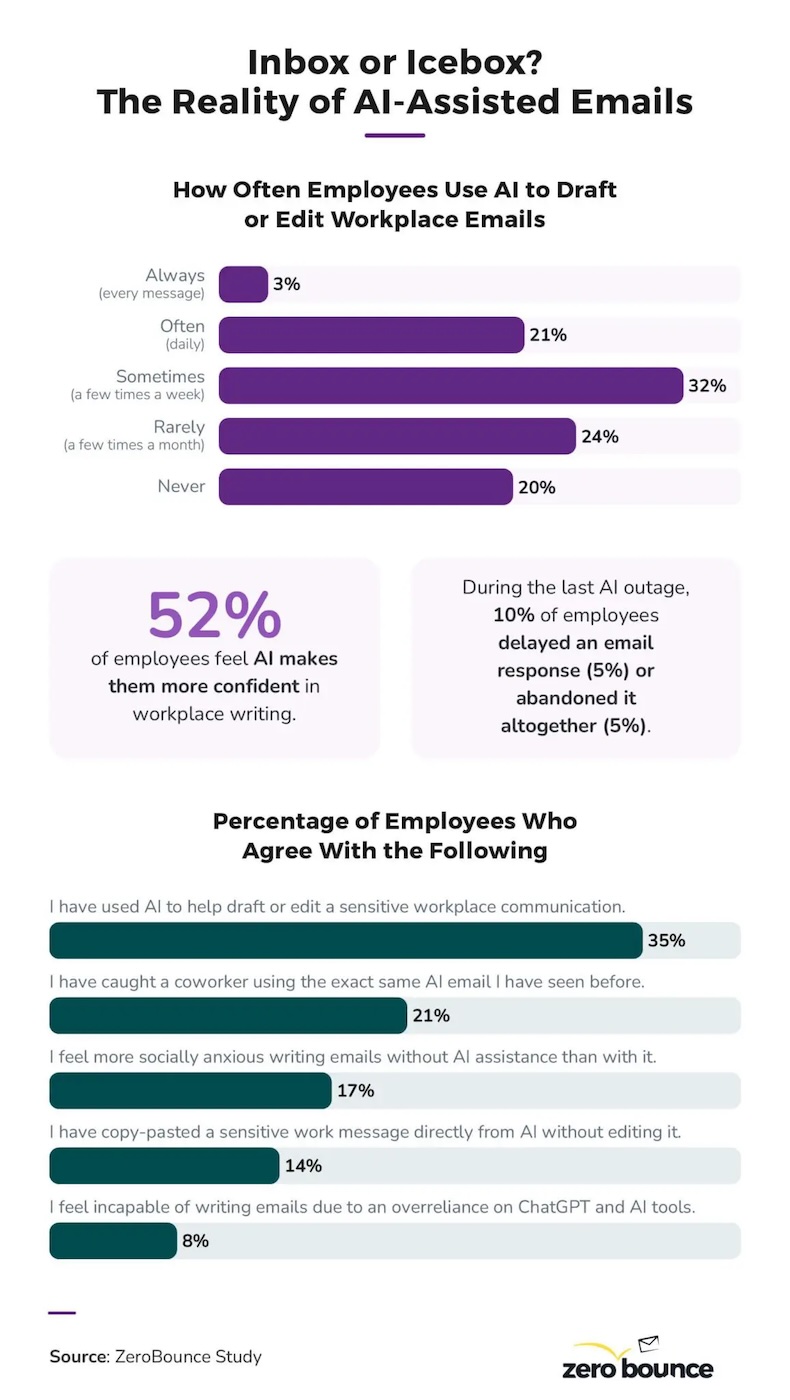 Nearly one-fourth of employees say they now use AI daily for creating workplace emails, according to recent research from ZeroBounce.