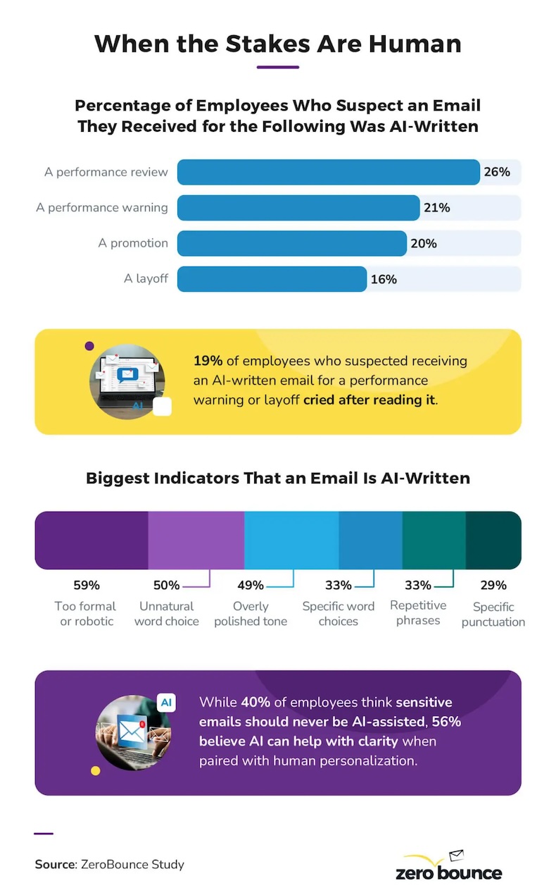 Employees say the top indicators that an email has been written by AI are that the language is too formal or robotic (59% say so) and the word choice feels unnatural (50%).