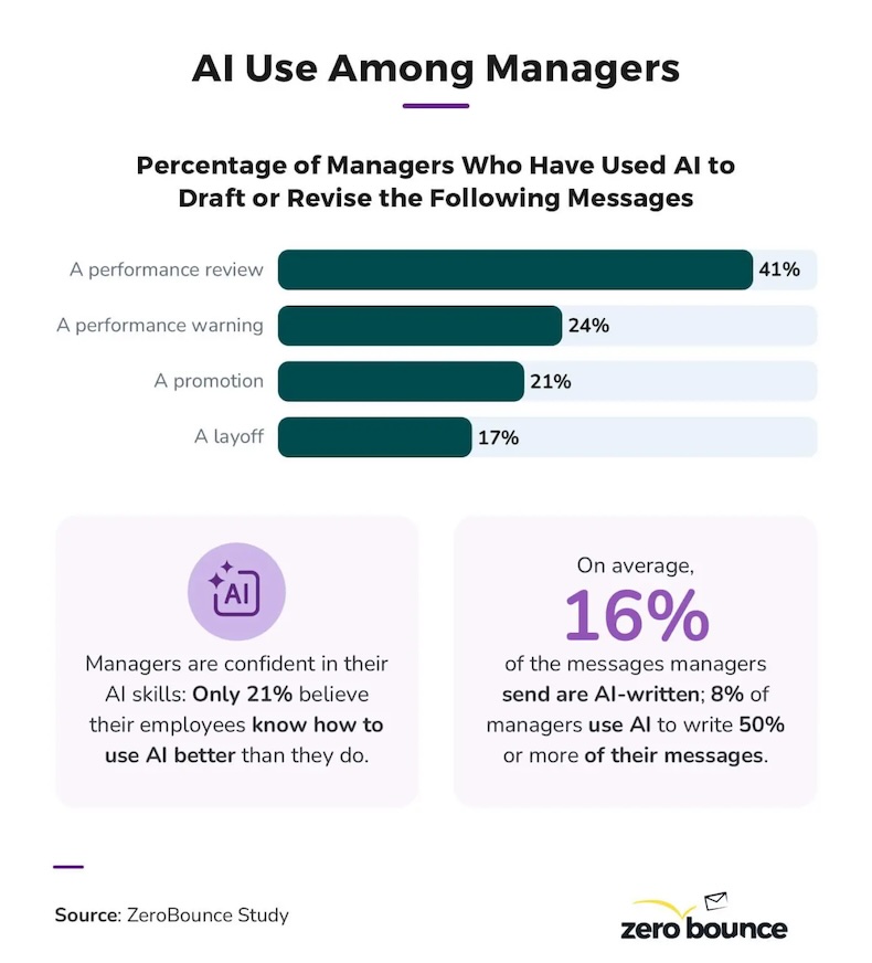 Some 41% of managers say they have used AI to draft a performance review message, and 24% say they have used AI to draft a performance warning message.
