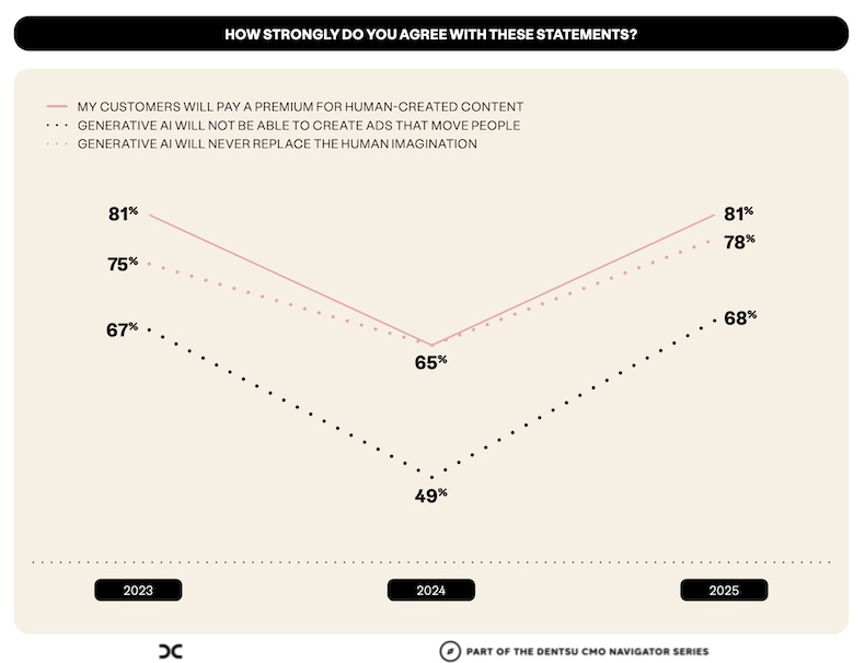 Most respondents believe customers will pay a premium for human-created content (81% agree), that generative AI will not replace human imagination (78%), and generative AI will not be able to create ads that move people (68%).