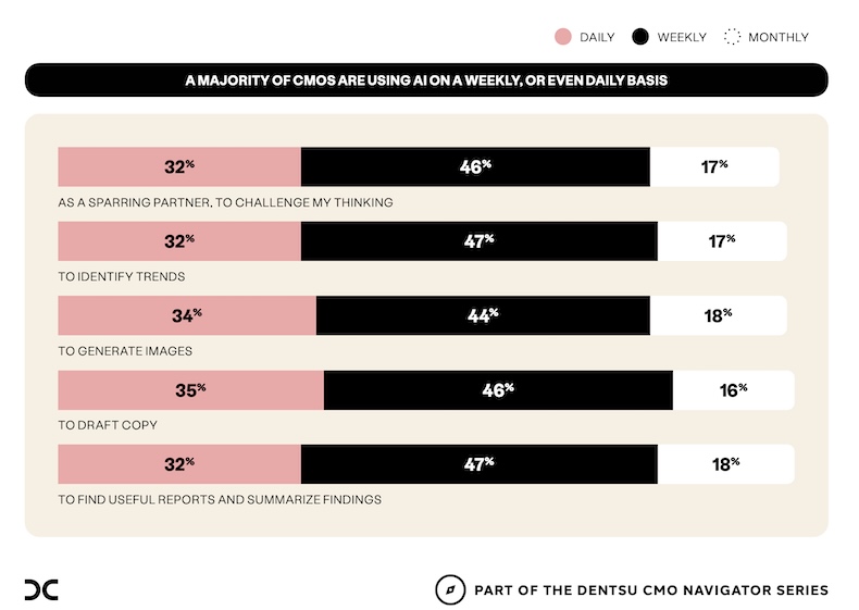 Most CMOs say they are now using AI tools at least weekly for a range of job-related tasks, including to generate copy, find useful information, and challenge their thinking, according to recent research from Dentsu Creative.