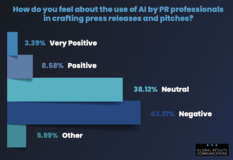 Some 44% of respondents say they have a negative view of the use of AI by PR pros to craft press releases and pitches, 12% have a positive view, and 38% are neutral.