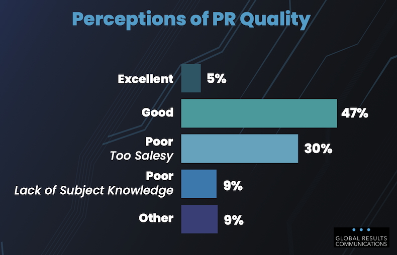 Some 47% of journalists say most PR content is of good quality, 39% say it is of poor quality, and 5% say it is of excellent quality.
