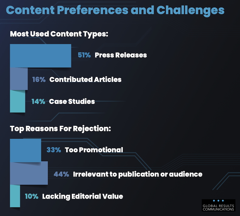 Journalists say the top reasons they reject PR content and pitches are that they're irrelevant (44% cite as a reason) and/or are too promotional (33%).
