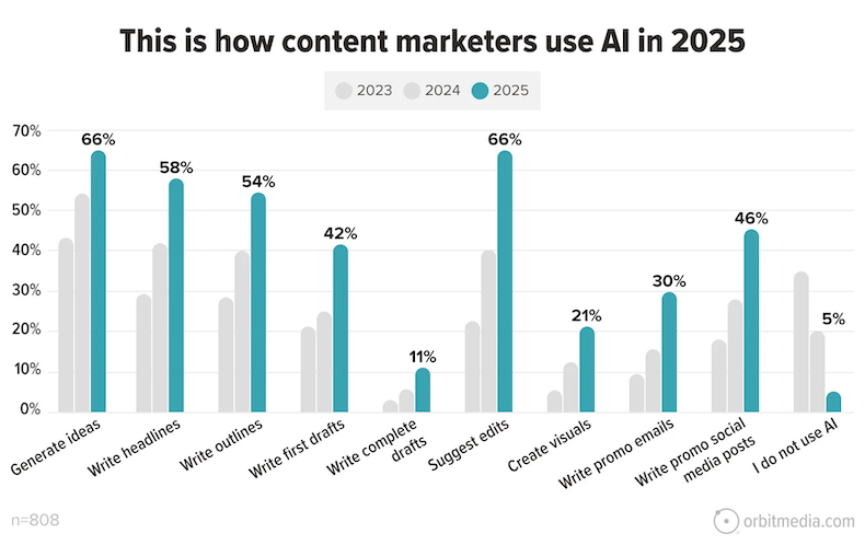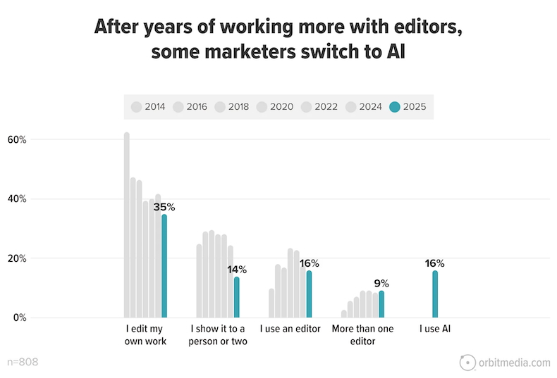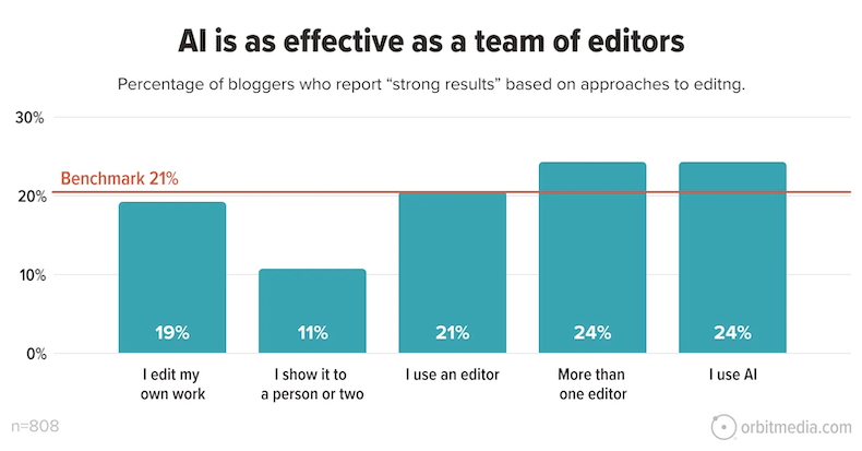 Marketers are increasingly turning to AI to edit their blog content, and they're finding AI to be as effective as a team of human editors, according to recent research from Orbit Media Studios.