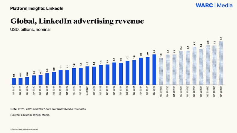 LinkedIn's global ad revenue is forecast to jump by 18.3% this year and increase by another 18.5% in 2026, according to recent research from WARC.