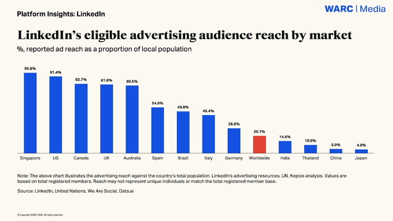 LinkedIn now reaches 20.7% of the eligible global advertising audience, according to third-party data cited by WARC. However, the platform's reach varies widely among different countries. For example, LinkedIn reaches 91.4% of the eligible advertising audience in the United States but only 5% of the eligible advertising audience in China.