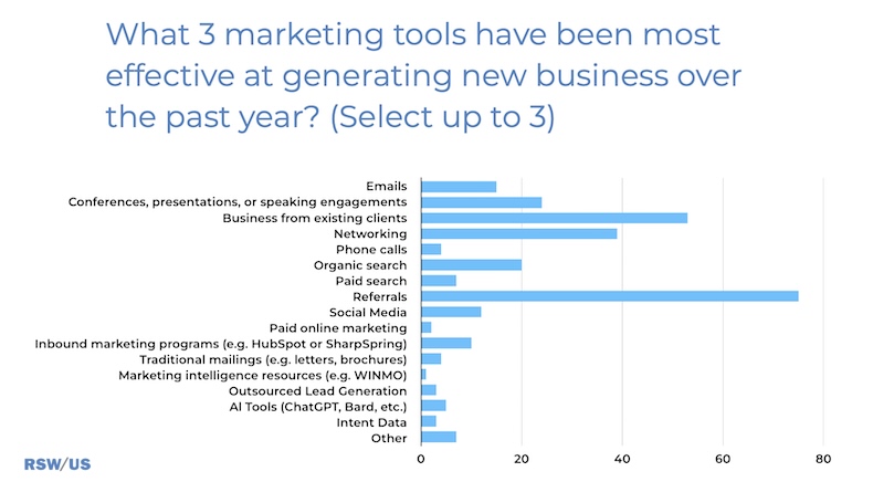Respondents say the marketing tools and tactics that have been most effective in generating new business over the past year are referrals, networking, and conferences/presentations/speaking engagements.