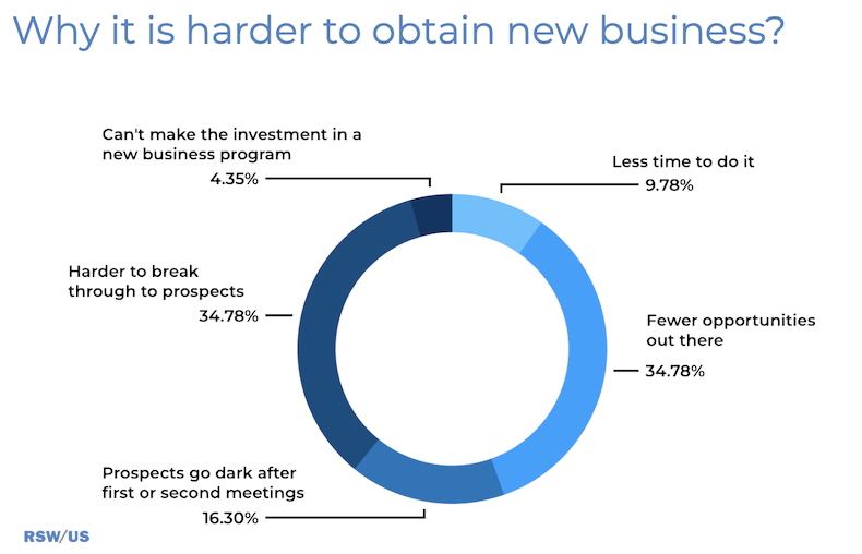 Respondents say the top reasons that it's been harder to obtain new business are that there are fewer opportunities out there and it's become harder to break through with prospects.