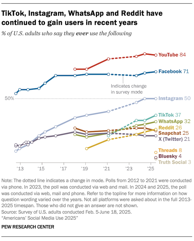 Some 84% of US adults say they use YouTube, 71% say they use Facebook, and 50% say they use Instagram.