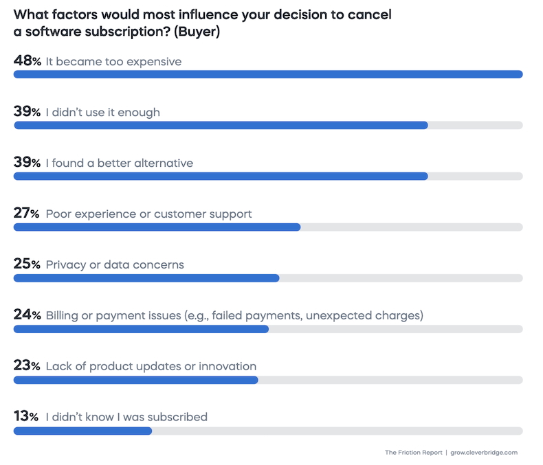 Buyers say the top factors that influence their decisions to cancel a software subscription are the expense (48% say so), a lack of use (39%), and finding a better alternative (39%).