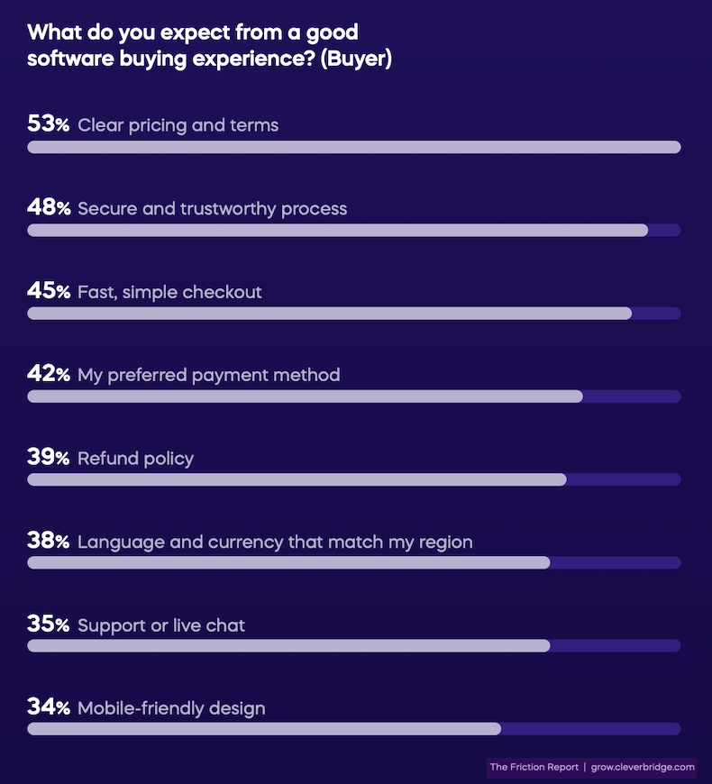Respondents say the things they expect most from a good software buying experience online are clear pricing and terms (53% say so), a secure and trustworthy process (48%), and fast, simple checkout (45%).