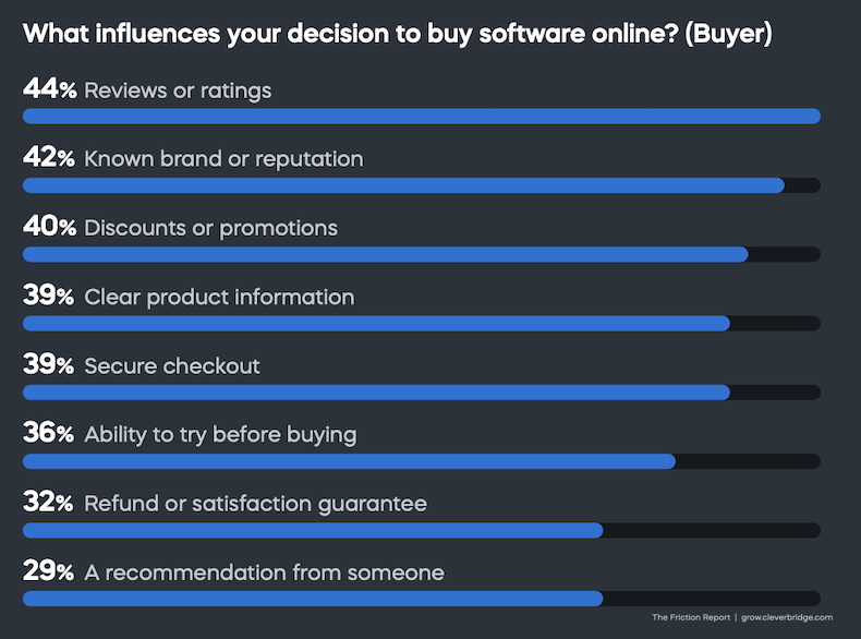 Buyers say the top things that influence their decision to buy software online are reviews or ratings (44% say so), a known brand or reputation (42%), discounts or promotions (40%), and clear product information (39%).