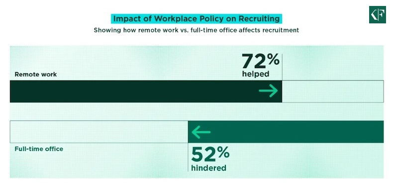 Some 72% of respondents say remote work options make it easier to recruit candidates and 52% say full-time in-office requirements hinder recruitment.