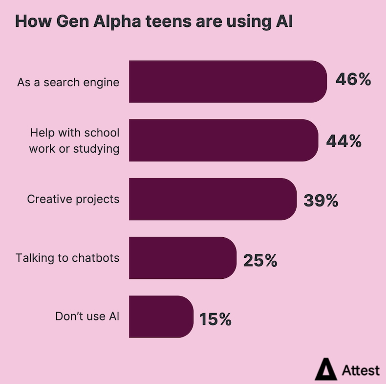 Respondents say their Gen Alpha children are most likely to use AI as a search engine (46% say they use), to help with school work (44%), and for creative projects (39%).