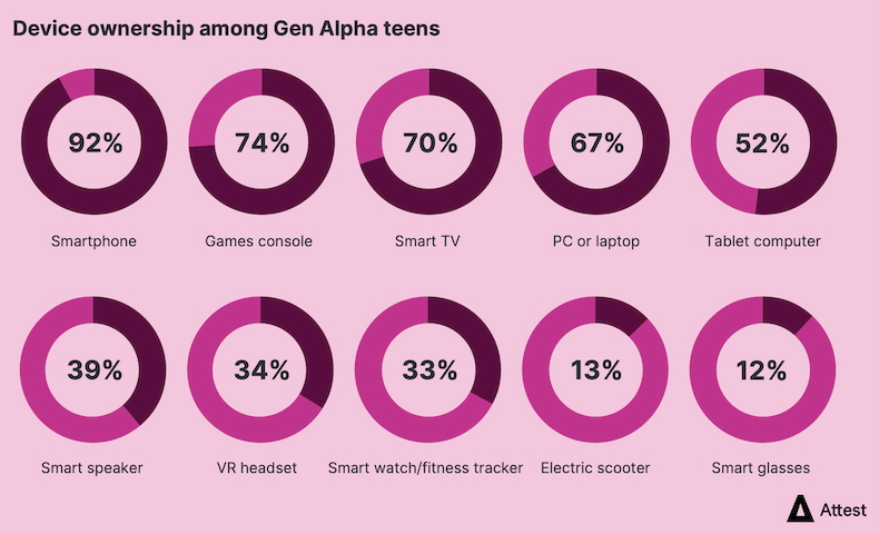 Some 92% of respondents say their Gen Alpha teen has a smartphone, and 74% say their Gen Alpha teen has a gaming console.