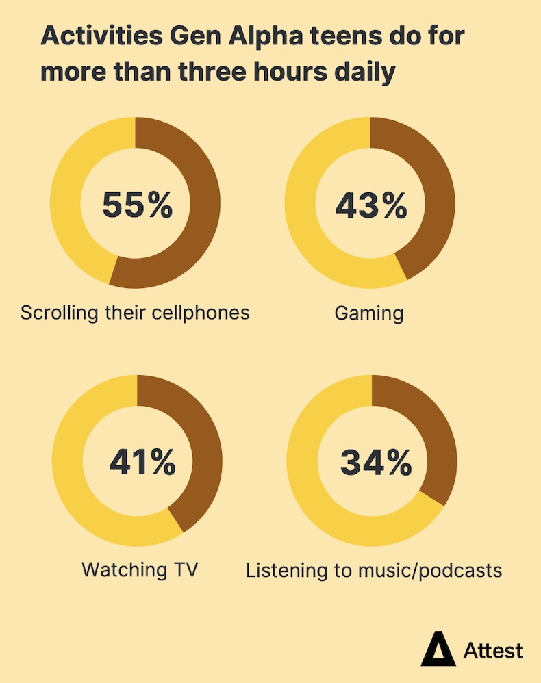 Most (55%) respondents say their Gen Alpha teen spends more than three hours scrolling on their cellphone daily.