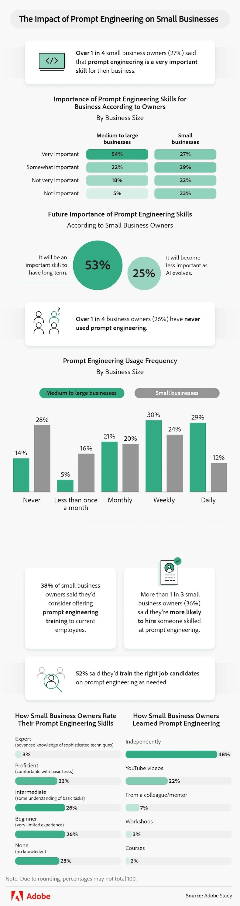 Some 27% of small business owners say AI prompt engineering is already a very important skill for their business, and 53% say it's an important skill to have long-term.