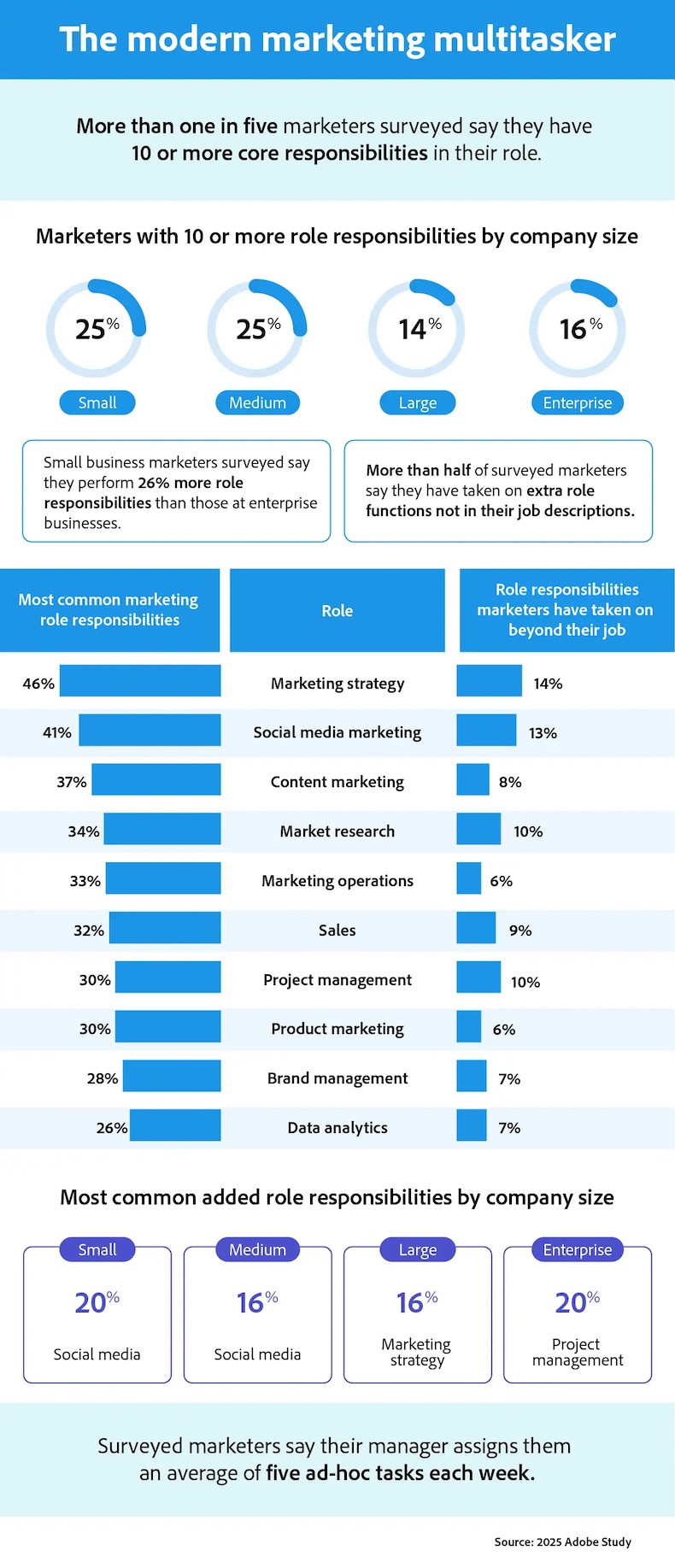 It looks at how marketing multitasking varies among company sizes and the most common role responsibilities for marketers.