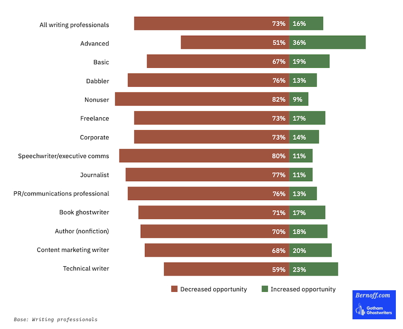 Most professional writers say they're now using AI tools for their work, and most also say that they think AI tools will lead to decreased opportunities for writers, according to recent research from Gotham Ghostwriters and Josh Bernoff.