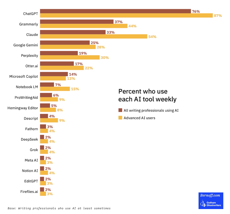 Among professional writers who use AI, the most popular tools are ChatGPT and Grammarly.