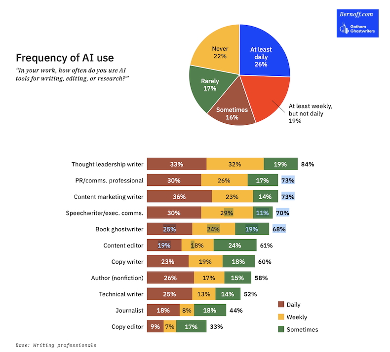 More than a quarter (26%) of professional writers say they use AI tools daily for writing, editing, or research; 19% say they use AI tools at least weekly; and 16% say they sometimes use AI tools.