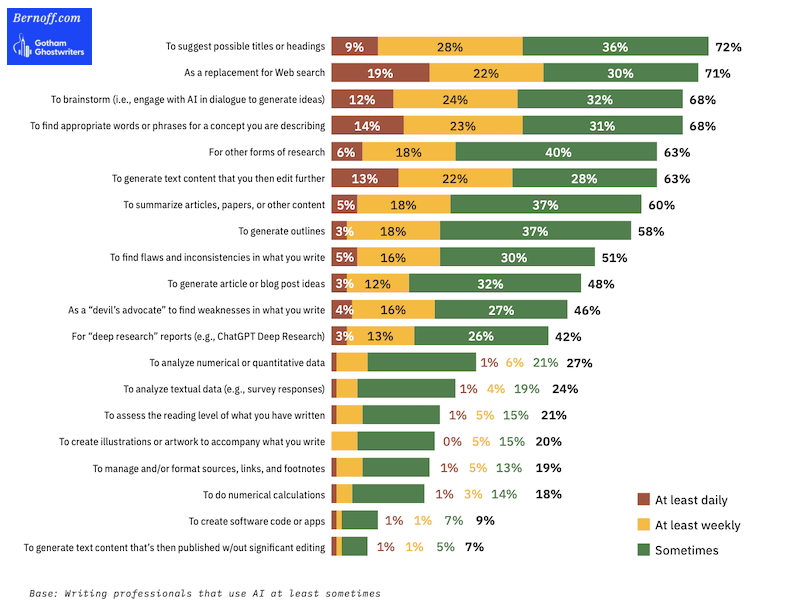 Professional writers say they're using AI tools most often to suggest possible headlines and titles, as a replacement for search, and to brainstorm.