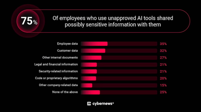 Three-quarters of respondents who use unapproved AI tools say they may have shared potentially sensitive information with these tools, such as employee data, customer data, and internal documents.
