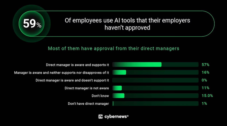 Some 59% of respondents say they use AI tools for work that their employer hasn't approved. However, 57% say their direct manager is aware of their use of unapproved AI tools and supports it.